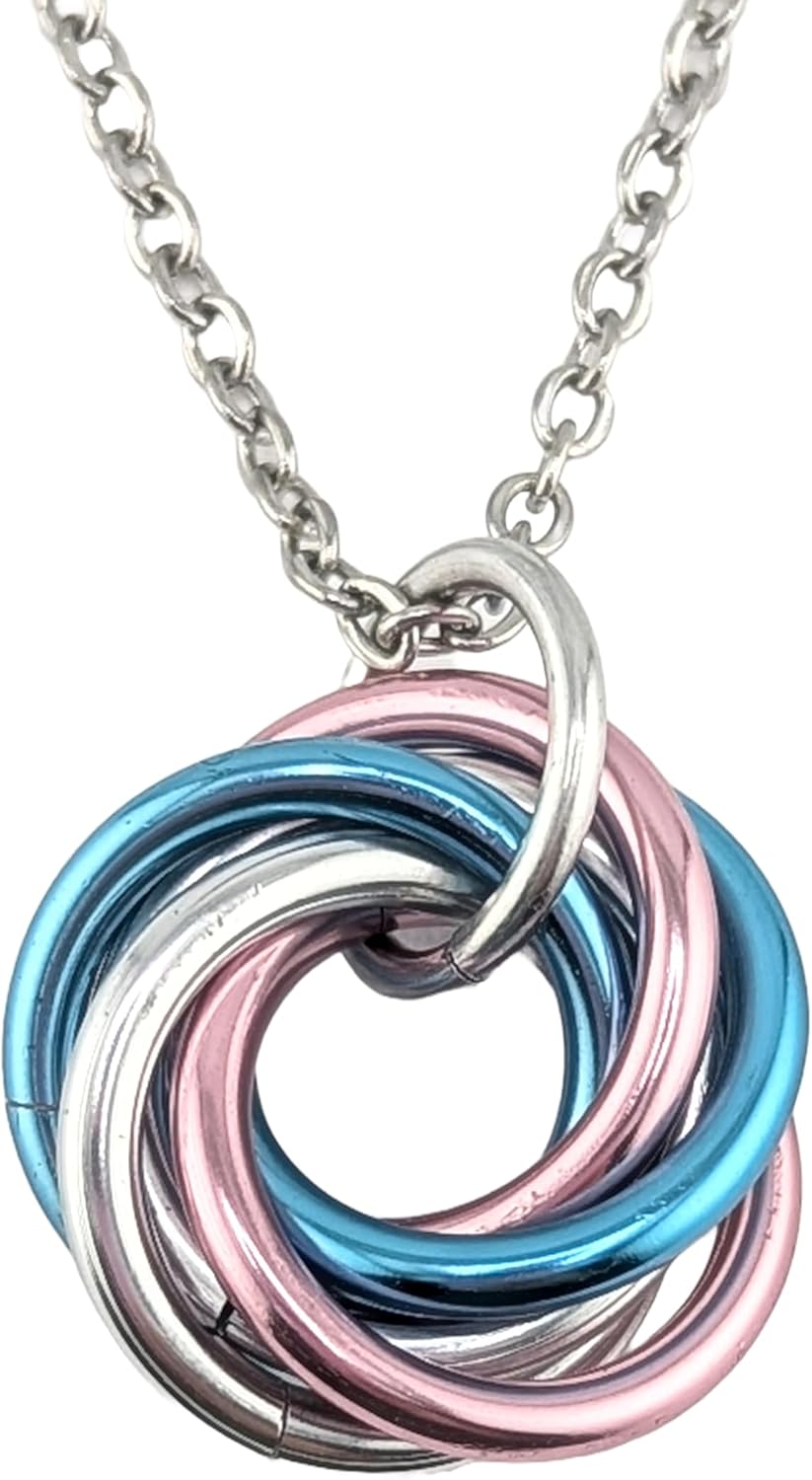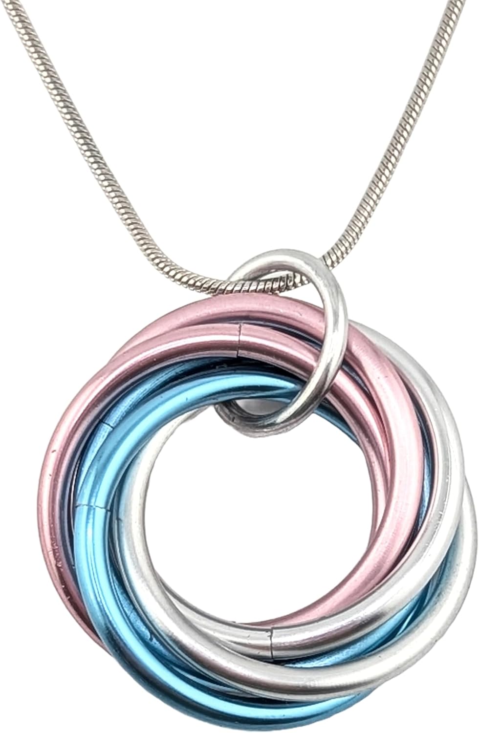 Featuring different trending aesthetic color combinations Beautifully simple Möbii, an infinity pendant charm. Stylish, beautiful and functional. Looks great and makes a great fidget item as well! The weave for the circle has no beginning or end, every ring in each circle overlaps every other rings in that circle. All rings are hand-woven and made of high-gloss anodized aluminum.