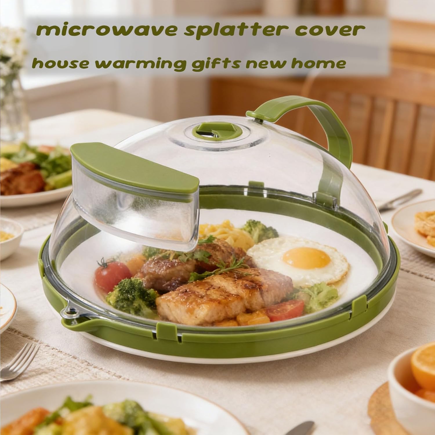 Description: Introducing our versatile microwave splatter cover, a must-have kitchen gadget for every household! This microwave cover with water steamer features a unique water reservoir that locks in food moisture and flavor during heating. Designed with sturdy handles, it works as a practical microwave cool caddy with handles for safe and easy grip. Its domed design prevents food contact, serving as a clean alternative to plastic wrap. Also known as tapa para microondas dentro, it is widely used in daily cooking. Keep your microwave clean and tidy with this magnetic microwave splatter cover that effectively blocks food splashes. It helps speed up heating, saving you time and effort. As reliable microwave plate covers for heating food, this microwave splatter cover with steamer can be used as a container lid, for outdoor dining, or to keep food fresh in the refrigerator. The hook holes allow easy hanging to save valuable kitchen space. Compact and practical, this microwave cover is perfect for dorms and makes an ideal gift. It is a great choice for house warming gifts and house warming gifts new home, combining functionality and style to upgrade your daily kitchen routine. Add this efficient microwave plate cover to your home essentials today! Item Name: Food Cover Material: Plastic Style: Home Kitchen Features: Dishwasher Safe, Integrated Handle, BPA-free Size Details: L: 26cm/10.24", W: 26cm/10.24", H: 11cm/4.33" (Approx.) Notes: Due to the light and screen setting difference, the item's color may be slightly different from the pictures. Please allow slight dimension difference due to different manual measurement. Package Includes: 1 x Food Cover