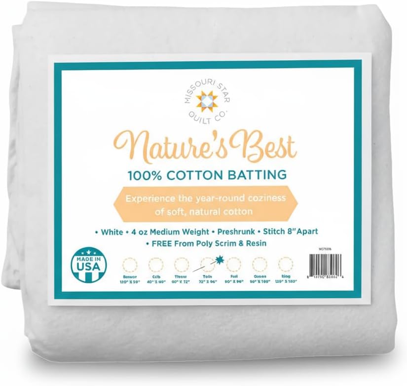 Wrap your quilts in the year-round comfort of Nature's Best 100% Cotton Batting from Missouri Star Quilt Co.! Crafted from soft, natural cotton, this premium batting is free from poly scrim and resin, pre-shrunk, and features a 4-ounce medium weight for the perfect balance of warmth and breathability. It can be quilted up to 8" apart and is available in seven convenient sizes. Plus, it's proudly made in the U.S.A.!