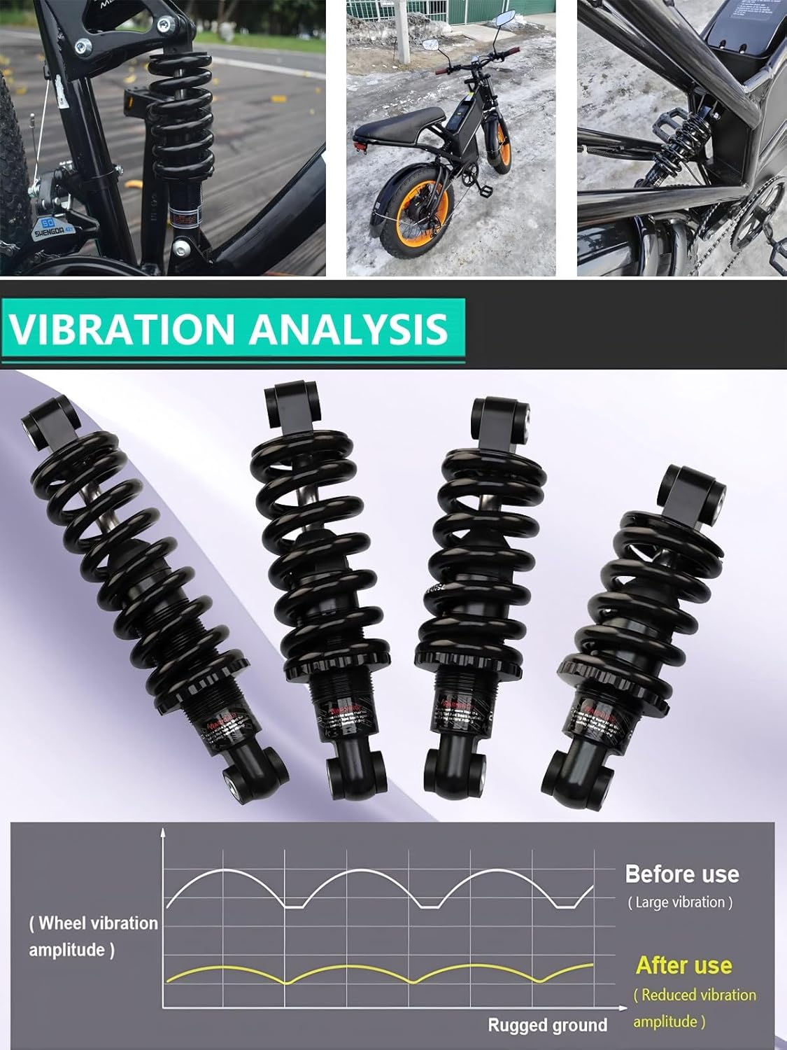 **๐๏ธ Heavy-Duty Mountain Bike Rear Shock Absorber** **Upgrade Your Ride with Precision & Durability** ๏ปฟ**๐ง Key Specifications:** - **Travel Lengths:** 125mm (5"), 150mm (6"), 165mm (6.5"), 190mm (7.5") - **Bushing Size:** 24mm Length | 8mm Inner Diameter - **Spring Rates:** 150Lbs~2000Lbs (15kg~210kg Weight Support) - **Weight:** 480g-1000g | **Color:** Sleek Black - **Included:** Shock Absorber, Bushing Screws, Hex Wrench Set ๏ปฟ**๐ดโ๏ธ Why Choose This Shock?** โ **Universal Compatibility** Fits XC soft-tail bikes, e-bikes, MTBs, folding bicycles, scooters, and battery cars. โ **Tailored Weight Support** 12 spring rates (150Lbs-2000Lbs) match rider weights from 15kg to 210kg. Find your perfect match: - *Example:* 150 Lbs: suitable weight: 15~20kg250 Lbs: suitable weight: 20~30kg350 Lbs: suitable weight: 30~40kg450 Lbs: suitable weight: 40~50kg650 Lbs: suitable weight: 50~60kg750 Lbs: suitable weight: 60~70kg850 Lbs: suitable weight: 70~90kg1000 Lbs: suitable weight: 90~120kg1500 Lbs: suitable weight: 120~160kg1800 Lbs: suitable weight: 160~180kg2000 Lbs: suitable weight: 180~210kgโ **Pro-Grade Shock Absorption** High-strength steel spring + precision damping reduces 60% trail bumps. Conquer downhill tracks, rocky paths, and urban commutes effortlessly. ๏ปฟโ **DIY-Friendly Installation** Pre-assembled with 24mm bushings and included hex wrenches. Swap worn shocks in 15 mins! ๏ปฟโ **Built to Last** Anti-corrosion coating withstands rain, mud, and harsh weather. Tested for 50,000+ cycles. ๏ปฟ**โก Instant Upgrade for:** - Worn-out rear shocks causing unstable rides - E-bikes needing reinforced suspension for heavy batteries - Foldable bikes requiring compact yet robust damping ๏ปฟ**๐ Trusted by 1,000,000+ Riders Worldwide** ๐ **100% Sati