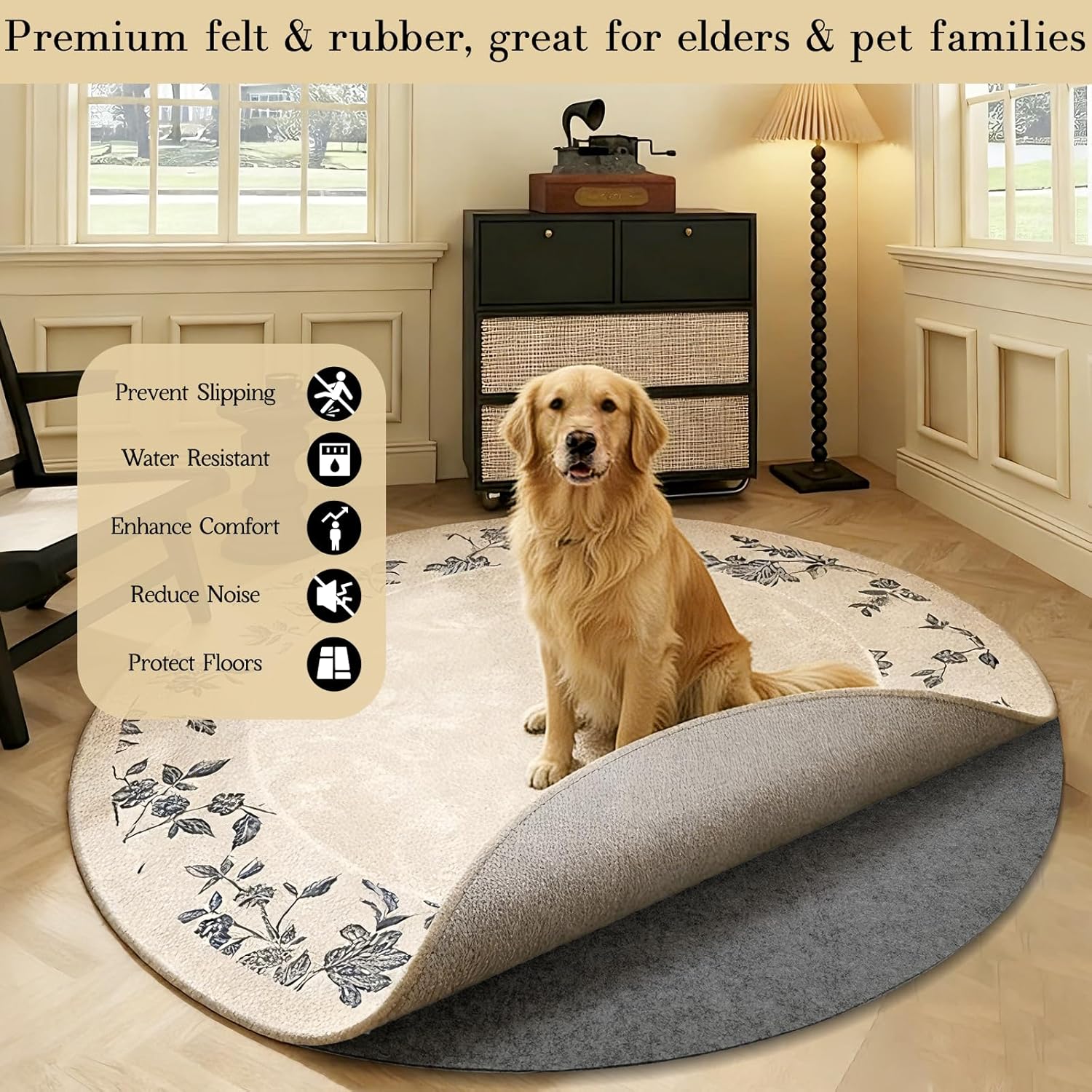 Imagine sunlight streaming into your living room—bare feet sink softly into the rug, wrapped in steady reassurance. This round felt rug pad sits subtly beneath, keeping the rug secure as you unwind with a book or sip coffee by the window. Its soft felt mutes footsteps for cozy tranquility; the waterproof silicone backing shields floors from spills and pet messes. Available in 3.94 FTand 4.92 FT, it’s easily trimmable (2 inches smaller than your rug) for a hidden fit, fitting bedrooms, kitchens, hallways, etc. Made of high-quality, chemical-free felt & silicone, it’s durable, fade-resistant, protecting your home decor and peaceful moments long-term.