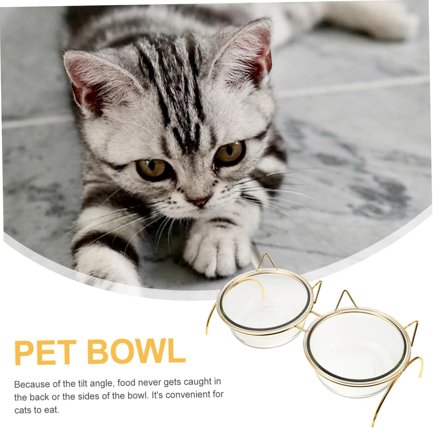 Package List 1 2 x bowls 1 accessories Features -Product Info:Cat Bowl SetGoods DescriptionWater Feeder - Material: Glass, iron.Cat Ceramic Bowl This item is an feeding bowl for your lovely pets which is a clean environmentally friendly bowl.Cat Feeding Bowl - This also keep your room clean, the stress of constant cleaning.Pet Eating Bowl - You can be sure that your cat comfortably feed without worrying about the bowl tipping over.Pet Food Bowl - With a tilt angle design, this elevated cat bowl keeps food piled nicely and falls to the center, that greatly reduces food waste, creates a perfect dining environment for your cat as well.Pet Bowl - Our cat food bowls have a perfect raised stand, allowing cats find comfortable when eating.High Base Cat Bowl This unique design device provides a perfect healthy environment for your beloved.Pet Feeder It features of stilt design, convenient for your pets to drink and won't overturned by your active pets.Pet Drinking Bowl - Help cat digest food easily, frequent vomiting and reduce neck burden.Pet Bowl Feeder Features - Color: Golden