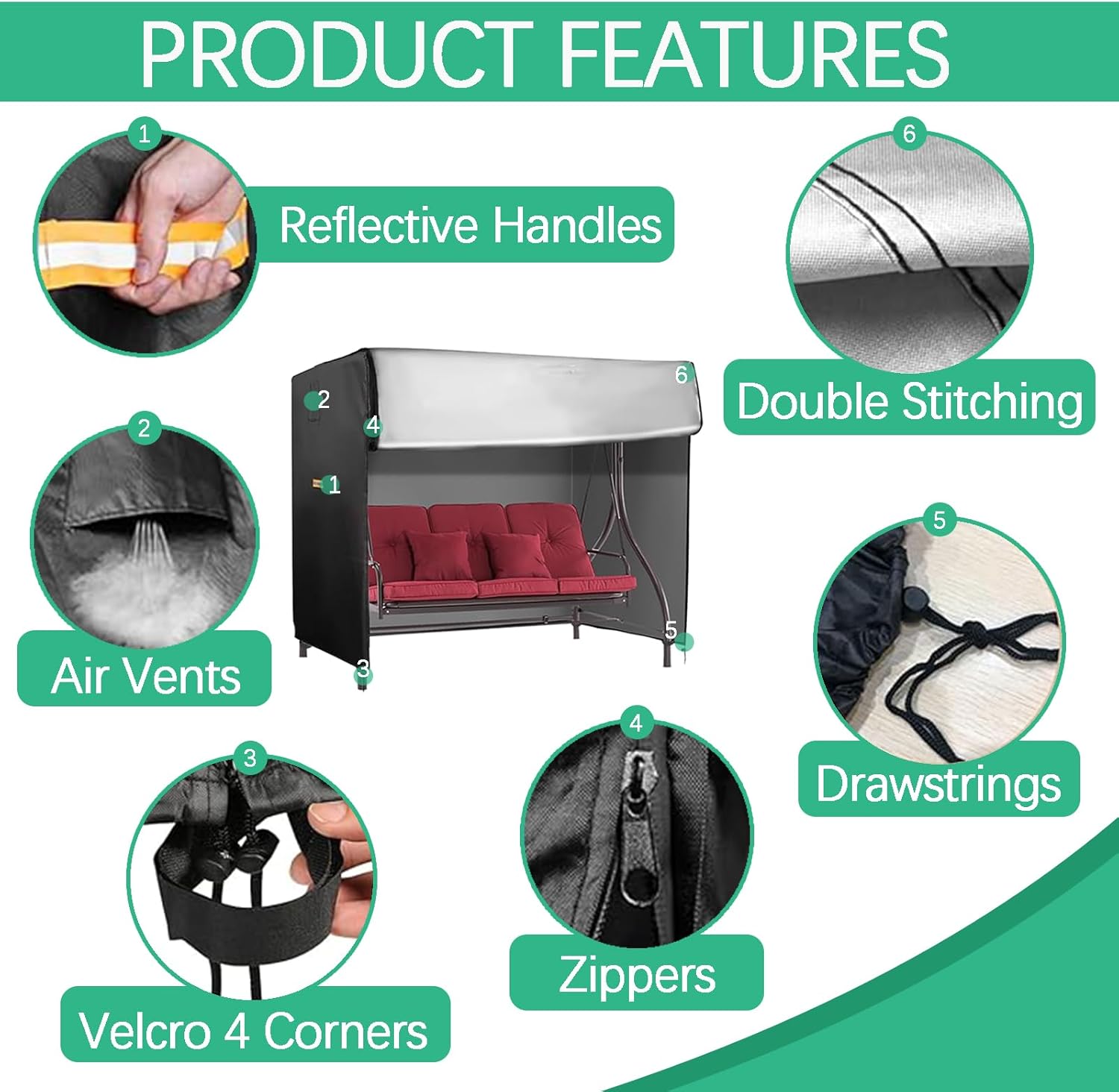 OUTDOOR SWING COVER·This porch swing cover waterproof fits for most canopy swings as patio furnitures, glider canopy cover, swing with canopy, patio swing cover, 3 triple seater hammock cover, outdoor furniture set, yard swings for adults with canopy.Cover Only.·Product Color:black, grey, silver·Product Dimensions:55 L × 26 W × 36 H in Outdoor Swing Cover67 L × 24 W × 46 H in Outdoor Swing Cover75 L × 28 W × 46 H in Outdoor Swing Cover87 L × 49 W × 67 H in Outdoor Swing Cover87 L × 57 W × 67 H in Outdoor Swing Cover100 L × 59 W × 72 H in Outdoor Swing Cover·Please measure carefully before purchasing·If you have any questions about our products or orders, please contact us by email, and we will be happy to assist you and respond to you within 24 hours.