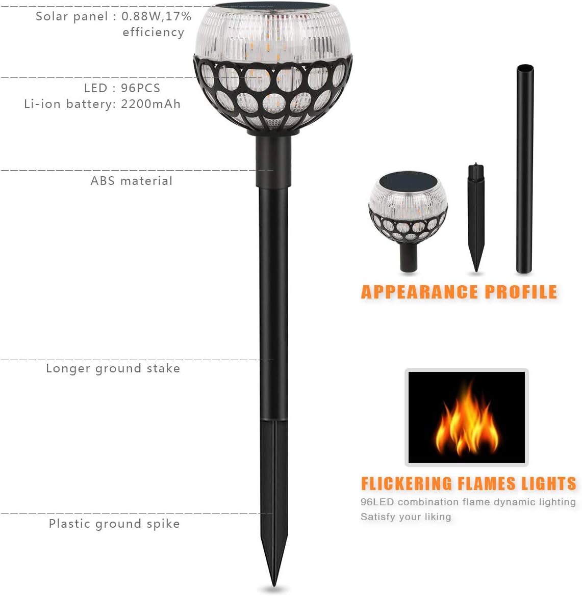 1. The lamp is made of high quality waterproof ABS plastic, and the body is in white when off. 2.Please use the key pin included in the package to unlock/turn on the solar light. 3. To ensure the waterproof function, the top part cannot be separated once it is assembled. 4. Keep the device away from fire and avert the product immersed in water. 5. Please make sure the solar panel can get the sunlight directly without any shelter or glass. 6. Both of the working time and charging time will be influenced by weather condition. 7. The lamp should be charged about 2 sunny days before you first use it. Specification: Color: black and white Power resource: solar powered Solar panel: 1.2W, 17% efficiency Battery type: 2200mAh rechargeable battery LED: 96pcs Lumen: 20 lm Color temp: 2800K Voltage: 5.5V Weight: 0.77 lb Size: 11*8*5.2 inch Charging time: 8 Hrs (charging time will be influenced by weather condition) Working time: up to 10 hours in summer and 5 hours in winter after fully charged Working mode: Auto turns on at dusk and off at dawn Package Include: 1*Plastic ground spike 1*1m Usb cable 2*Longer ground stake 1*Flare fixing base 1*LED solar torch light 1*User manual 3*Screw