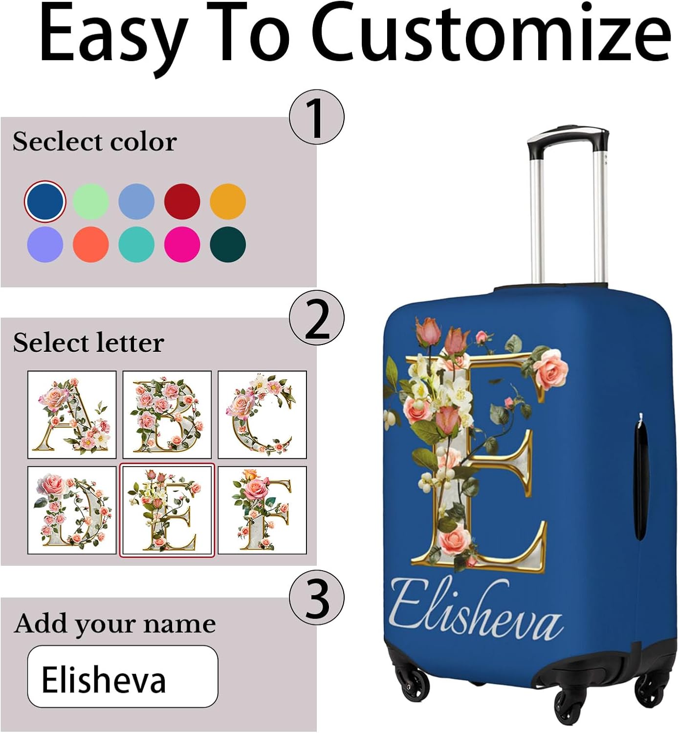 Are you still trying to find the perfect luggage case?Why choose our custom personalized luggage cover?Personalized customized luggage covers create a brand new travel experience for you.Click the 'Customize Now' button to start creating your exclusive custom luggage cover. Enter your name and select your favorite color to customize your own unique personalized suitcase covers for luggage.Our custom luggage case cover adopts all-round double stitching and high elasticity material to ensure that your luggage stays closed during travel; Using high-quality ink for high-definition printing, the colors are bright and vibrant, allowing you to enjoy the same clear and detailed image as the original work.We offer a range of travel equipment options, and you can choose whether to customize neck pillows and custom luggage tags according to your needs. Choosing these equipment can make your journey more comfortable and convenient.The unique custom luggage covers can make your luggage very conspicuous, allowing you to find your own luggage among numerous suitcases and making your travel or business trip easy.We offer four sizes for you to choose from1 S: 18-21 inch luggage compartment2 M: 22-24 inch luggage compartment3 L: 25-28 inch luggage compartment4 XL: 29-32 inch luggage compartmentusage method1. Pull up the lever2. Insert one of the holes into the pull rod3. Pull down the luggage compartment cover4. Expose the side hand hole5. Secure the bottom zipper6. Insert the fixed buckle to perfectly protect the luggage compartment shell[Special note] This custom suitcase cover is only suitable for luggage with the handheld part in the center position. Due to different measurement methods, an error of 1-3cm in this size data is normal.Intimate service --If you have any questions, please feel free to contact us and we will provide you with high-quality service.