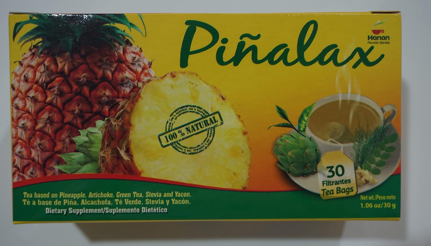 PINALAX Tea is crafted from a carefully selected blend of botanicals, including Pineapple (Piรฑa), Artichoke (Alcachofa), Green Tea (Te Verde), Stevia, Yacon, and other herbs. This unique formula supports digestive health by promoting the natural removal of bodily impurities. *Statements regarding dietary supplements have not been evaluated by the FDA and are not intended to diagnose, treat, cure, or prevent any disease or health condition.