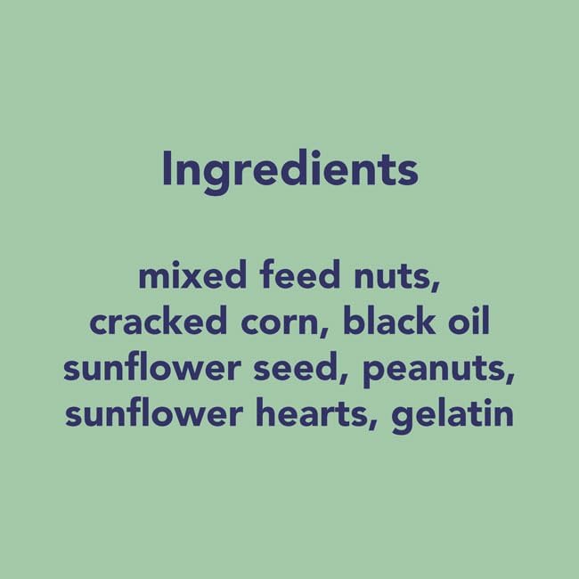 | Special Ingredients | rendered beef suet, cracked corn, peanut and tree nut pieces, millet, white millet, black oil sunflower seed, cashews, peanuts, sunflower seeds |