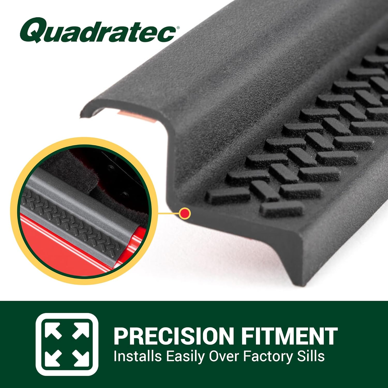 The Quadratec Custom Fit Entry Guards are the perfect accessory for doorway protection on your Wrangler. Unlike other entry guards, this exclusive design offers the most coverage of the Wrangler's door sills, providing the ultimate protection against scuff marks or paint chipping. The injection-molded guards provide a precision fit and install in minutes with no drilling or modifications to the Jeep. Made from virtually indestructible black TPE (Thermo Plastic Elastomer) material, these guards are built to stand up to a lifetime of abuse. The polygon tread design echoes many other original equipment accessories, and the included 3M peel and stick adhesive allows for quick installation over the factory door sills. This is an excellent choice for anyone looking to preserve the pristine condition of their Wrangler, or for those who simply want an extra layer of protection against the elements. With its superior coverage and easy installation, the Quadratec Custom Fit Entry Guard is a must-have for any Wrangler owner.