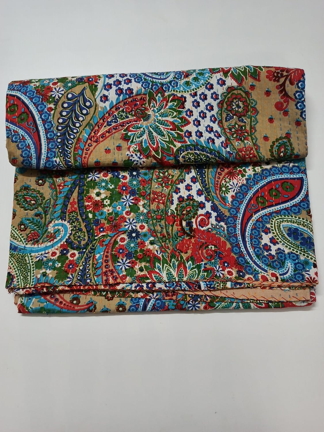 Made with 100% cotton and natural vegetable colors. This piece is of art is completely hand stitched by Women artisan in Rajasthan, India. It can make any room alive with its vivid colors, stunning Paisley print and embroidery, made using traditional and famous kantha hand embroidery method. Made from two thin layer of cotton fabric make this piece of art irresistible and also very comfortable. Adding to it's style, this kantha quilt is reversible and both sides can be used. Kantha is still the most popular form of embroidery practiced by rural women.typically use old saris and cloth and layer them with kantha stitch to make a light blanket, throw or bedspread. These cotton lightweight "Quilts" with a beautiful and colorful Paisley design can be used as 1. Bedspread , Bedding Throw , Blanket Or Quilt 2. A Summer Bed Cover 3. A Throw 4. A Fabulous Picnic Rug 5. Nice Bedroom Quilt , This can fit to a 90 x 108/60*90/108X108 inch's wide King/Twin size bed as blanket or throw or can easily fit as bedspread / bed cover to King/Twin bed .Size Twin (60X90), Queen Size (90X108 inch), King Size (108X108) inch