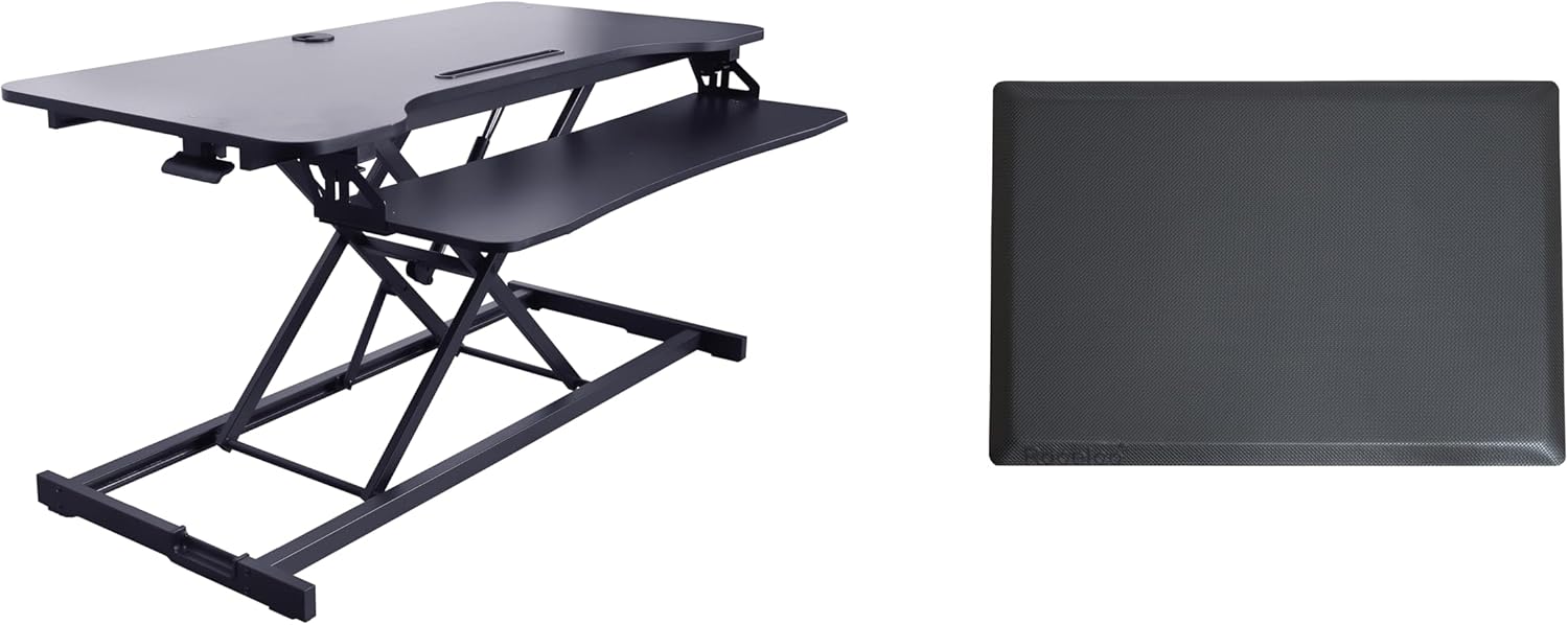 The VADRB Height Adjustable Sit to Standing Desk Riser and Converter offers the versatility you need to get through your work day. Now you can sit part of the day or stand to take advantage of all the health benefits that come with standing and moving around. With the VADRB, you and your associates will become healthier and more productive. It fits over your current desk with no need to buy additional furniture. With its spacious 31.5 W x 16.4" D work surface, you can hold up to 2 large monitors, a laptop, and more. It also includes an extra large keyboard tray that measures 30" W x 10" D that is an ergonomic 4" below the desktop. EVR Enhanced Vertical Range rises up to 19.7" and down to 4.3", to optimize the ergonomic work position for people of all heights. Straight up and down motion minimizes required depth (17"). Gas piston assist allows you to easily raise and lower up to 30lbs. Grommet hole allows you to route cables or add an optional single or dual monitor arm such as the Rocelco DM1 or DM2. Fully assembled and ready to go. The VADRB Height Adjustable Sit to Standing Desk Riser and Converter offers the versatility you need to get through your work day. It fits over your current desk with no need to buy additional furniture.