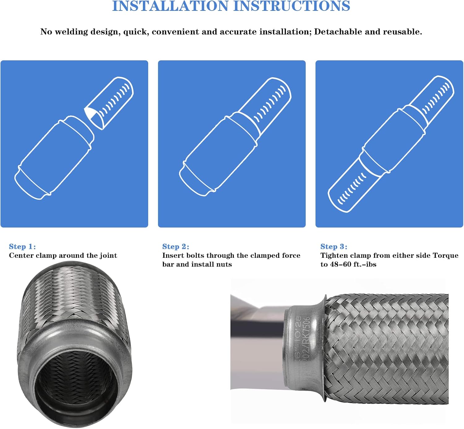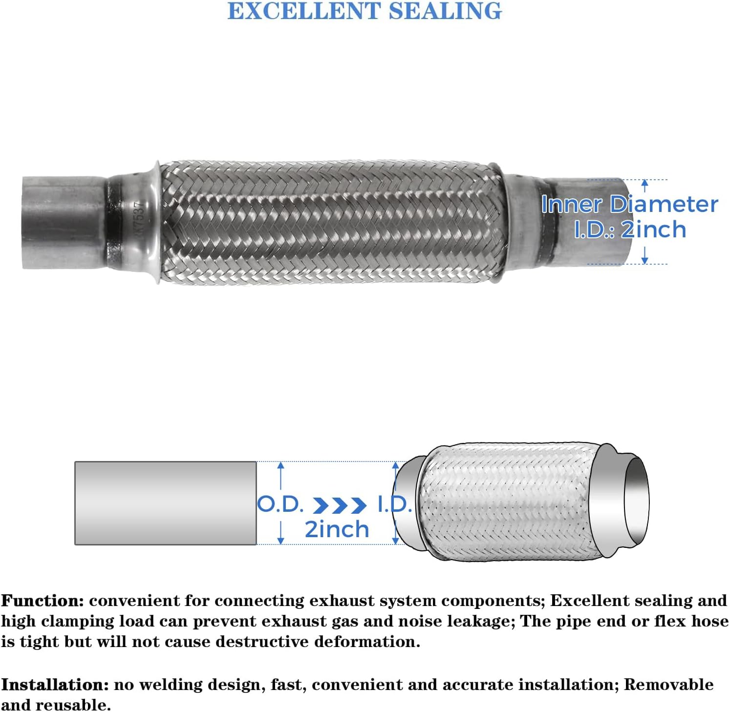 There is no instruction manual; professional installation is highly recommended Fitment: - Universal For 2" inlet/outlet diameter Flex Pipe . Product Specification: - Inlet/ Outlet Diameter: 2" ID,2.125"(2 1/8") OD- Body length: 10 inch- Overall Length: 14 Inch (2 extension length) - Style: Directly Weld On- Material: Stainless Steel, Double Braided construction- Durable and Corrosion and Water Resistant; Exquisite workmanship90 Days Warranty and 30 days free replacement or return/refund service. If you have any questions, please contact us. Thanks. Package Included: 2 x Flex PipeInstallation: Weld on How to Install the Flex Pipe1. Grab the bolts holding the flex pipe to the flange on the muffler with a wrench. Turn counterclockwise to remove them. Then pull the flex pipe out of the flange.2. Remove the clamp holding the flex pipe to the exhaust downpipe.3. Pull out the old gasket that sat between the flex pipe and the muffler flange. Then clean out the flange.4. Hammer out any dents from the end of the exhaust downpipe. Loosen the nuts holding the muffler and downpipe. 5. Coat a new muffler gasket with exhaust sealer, then place it in the muffler flange and fit the end of the new flex pipe over it.6. Coat the end of the downpipe with more exhaust sealant and place the free end of the new flex pipe over it. Adjust the position of the muffler and downpipe until the flex pipe is straight but free of tension.7. Thread bolts through the holes in the end of the flex pipe attached to the muffler flange. Tighten them to secure the pipe to the flange.8. Place a new clamp around the flex pipe where it meets the downpipe and tighten it. Retighten the bolts holding the muffler and downpipe and cut any plastic ties that are wrapped around the flex pipe.