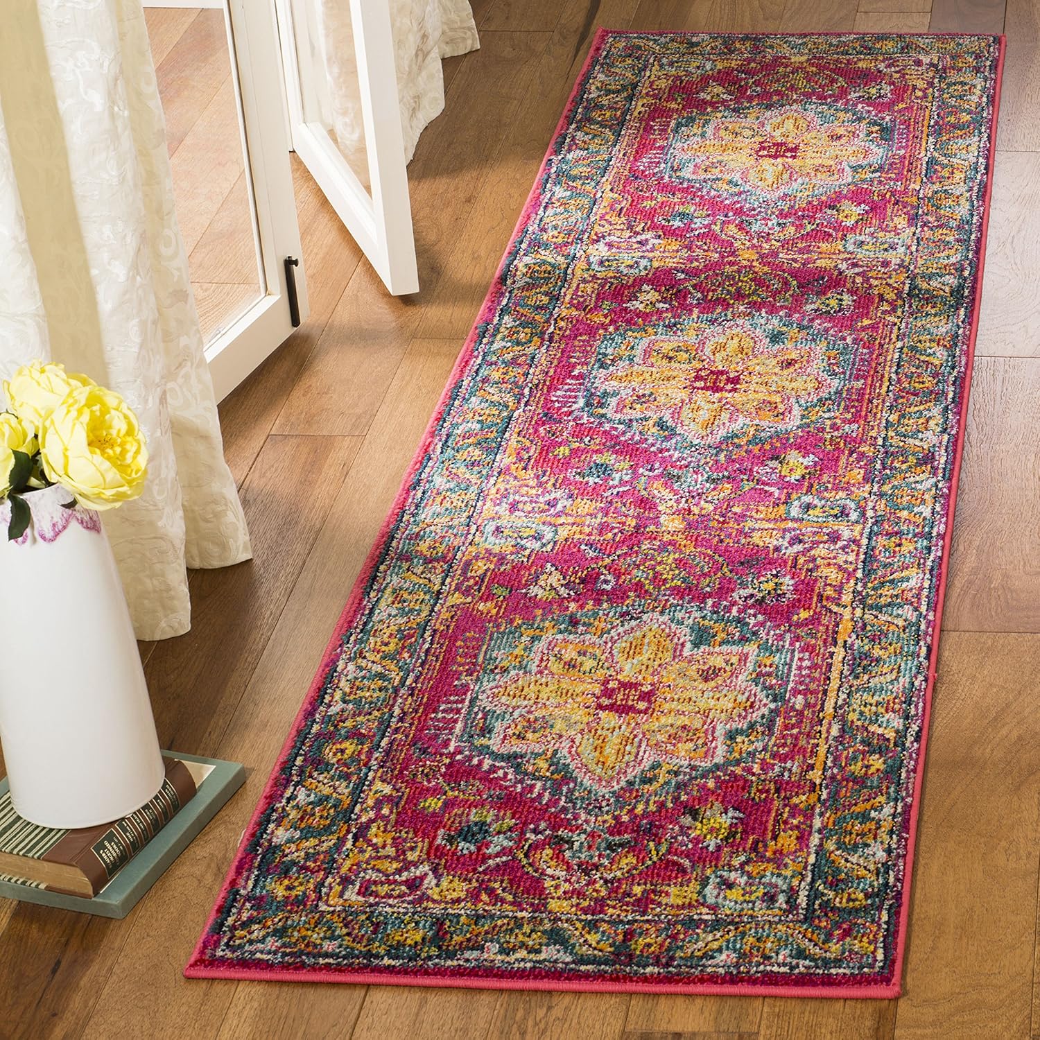 Brighten up your hardwood or tile floors, and add a touch of bohemian-vintage style to your home with rugs from Safavieh's Phoenix Collection. Oriental designs with a border and central medallion are given a makeover with trendy colors for the contemporary home. These rugs have a half-inch pile height and are power-loomed with a polypropylene frisé weave.