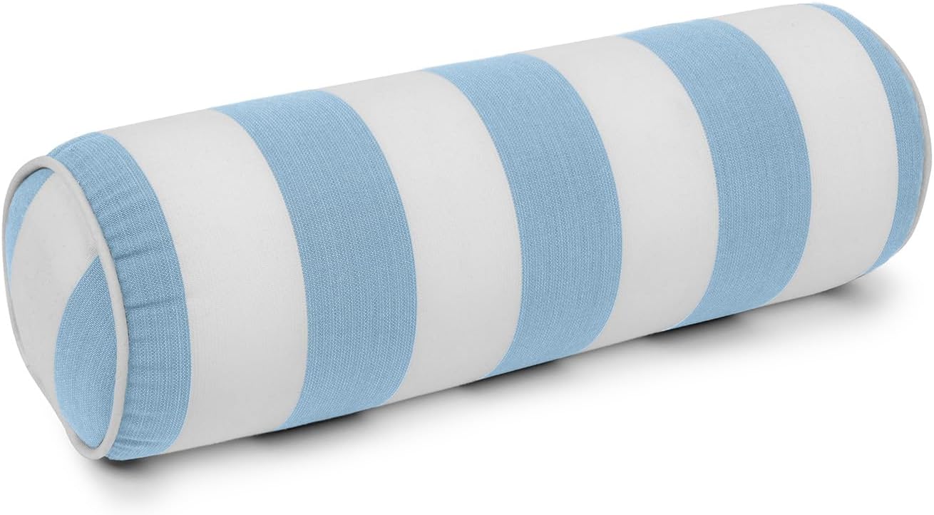 Sherry Kline's Cabana Stripe "Designer's Choice" outdoor/indoor neckroll bolster with cording, customized cut, zippered opening for removable cover. Filled with polyurethane foam insert. Fill does not go flat like polyester fill. The cover is machine washable. Made in U.S.A.