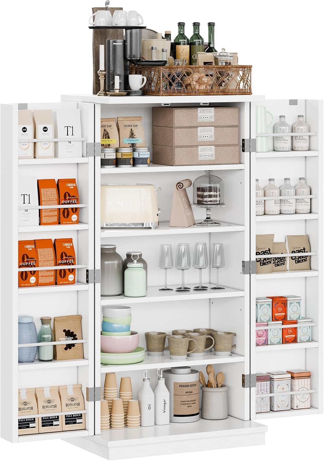 Give your home a touch of modern feel with Shintenchi storage pantry cabinet. Featured 5 shelves and 10 side racks, this kitchen pantry cabinet is designed to meet your various storage needs. Your room would be tidy and clean after you put sundries in and then close the doors. And the height of the middle boards can be adjusted. You can simply adjust the height or just move the board away to storage tall item. The adjustable shelves will meet your personel storage needs. And the top area can also be used to display painting or planting. The freestanding pantry cabinet is made of high-quality MDF board, ensuring years of lasting. Selected material and sturdy construction making this storage cabinet built for daily life. Not only being a kitchen pantry cabinet, this cabinet is also suitable to collecting albums as a craft cabinet, storaging sundries in your bedroom, putting shampoo and toilet paper in your bathroom. More storage possibilities for you to explore. The freestanding pantry cabinet is made of high-quality MDF board, ensuring years of lasting. Selected material and sturdy construction making this storage cabinet built for daily life.