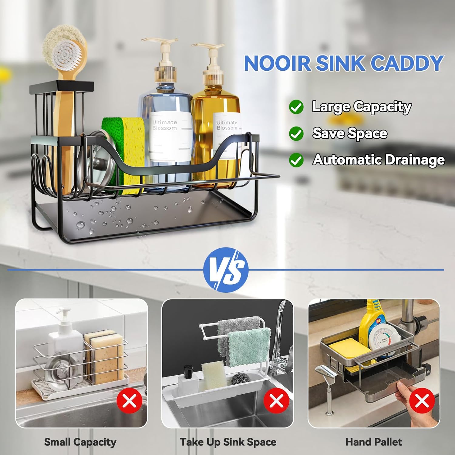 The Nooir sponge rack offers ample storage space, accommodating up to: 1 soup dispenser, 2 sponges, 2 brushes, 1 sink strainer and 1 dishcloth. If you have any questions, please feel free to contact us via Amazon. We are always ready to assist and look forward to hearing from you!