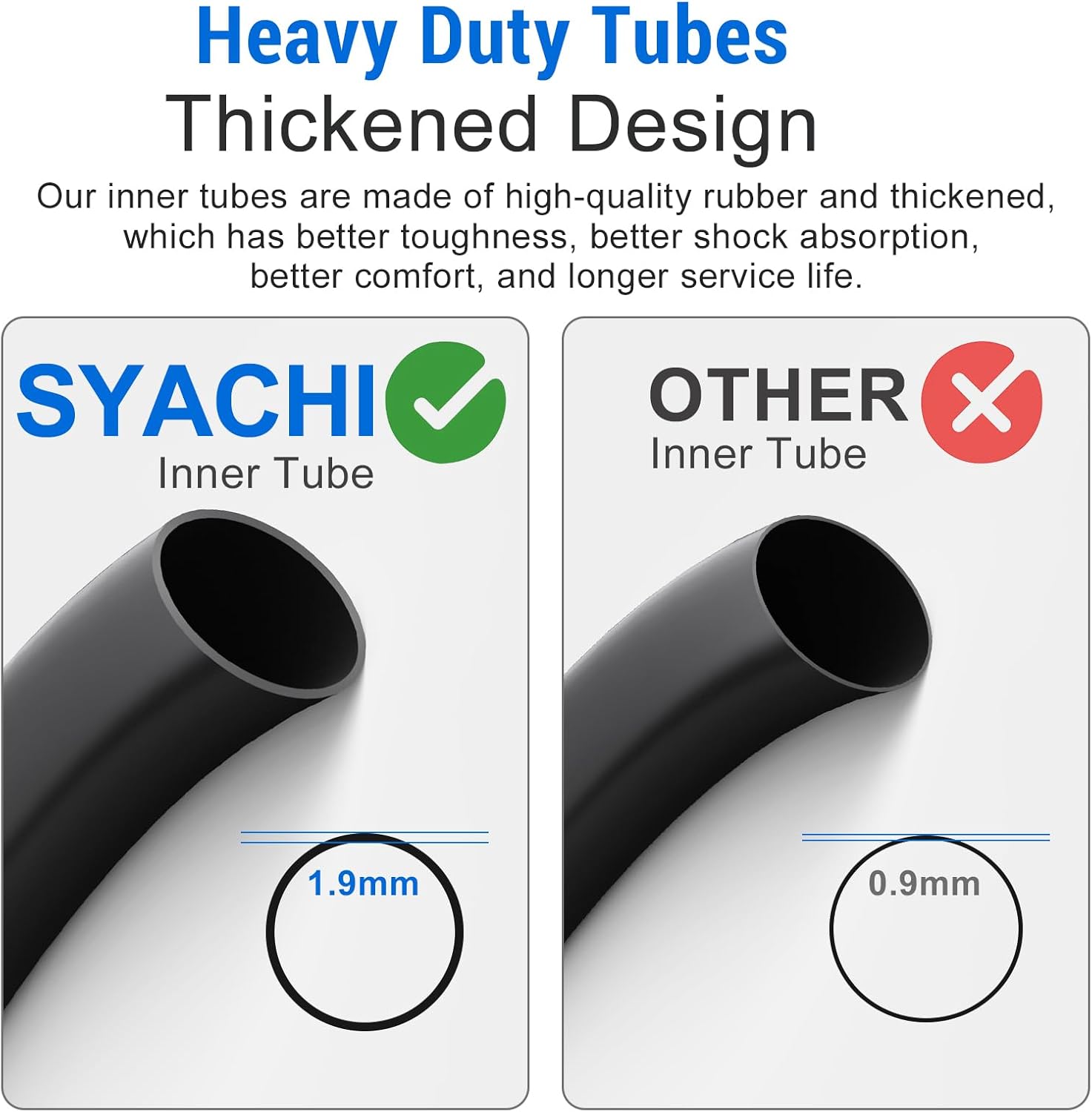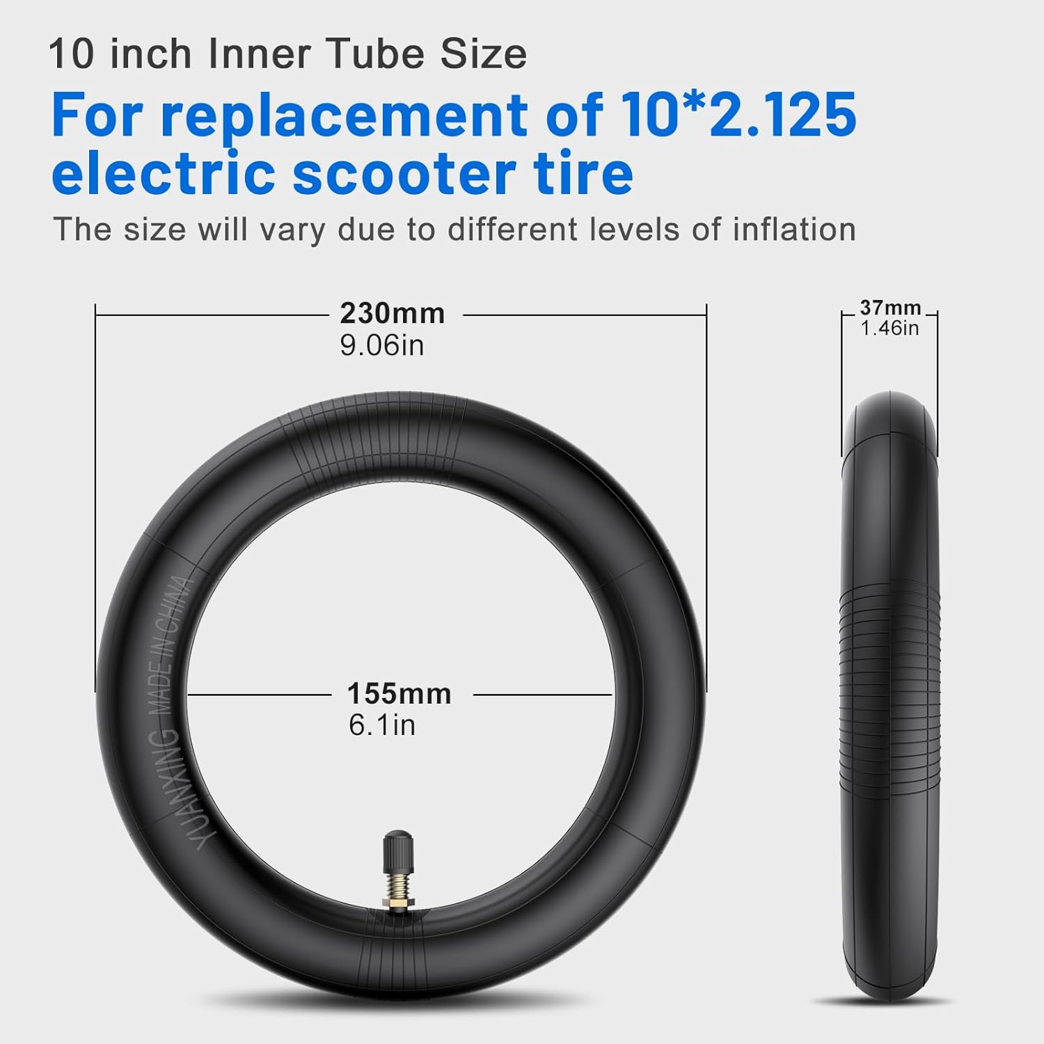SYACHI 10x2.125 Tire with Inner Tube, for Segway Ninebot F20, F25, F30, F40, F Series,for 10x1.75, 10x1.90, 10x1.95, 10x2, 10x2.125, 10 1/2x2 1/4 size tire. Product information Product: 60/70-6.5 E Scooter Tire Set Tire Material:butyl rubber Size:9.84×9.84×1.97 inch/25.00×25.00×5.00 cm SYACHI 60/70-6.5 E Scooter Tire Set Tire description SYACHI electric scooter tire set measures 10 x 2.125 is suitable for Segway Ninebot F20, F25, F30, F40, F Series.Also suitable for 10x1.75, 10x1.90, 10x1.95, 10x2, 10x2.125, 10 1/2x2 1/4 size.The high quality rubber provides excellent elasticity, airtightness and puncture resistance, together with the corrosion-resistant alloy valve and thickened base, correct use can stabilize the tire pressure and ensure no inflation for 6 months.The tire is elastic, the actual size of the tire is bound to be smaller before installing it on the scooter wheel hub, otherwise the tire will not be installed tightly and will easily fall off from the scooter wheel hub. Do not use a sharp pry bar when installing, it may damage the inner tube. 10x2.125 Tire with Inner Tube functional characteristics 1. No odor 2. Resistant to corrosion and abrasion 3. Anti-aging, performance does not deteriorate 4. Anti-puncture and anti-blowout tires 5. Off road texture Anti-skid protection 6. High maneuverability 7. High pressure resistance 8.Tear resistance 9.High quality airtightness Packing list: 1. 10*2.125 outer tire 2. 10*2.125 inner tube