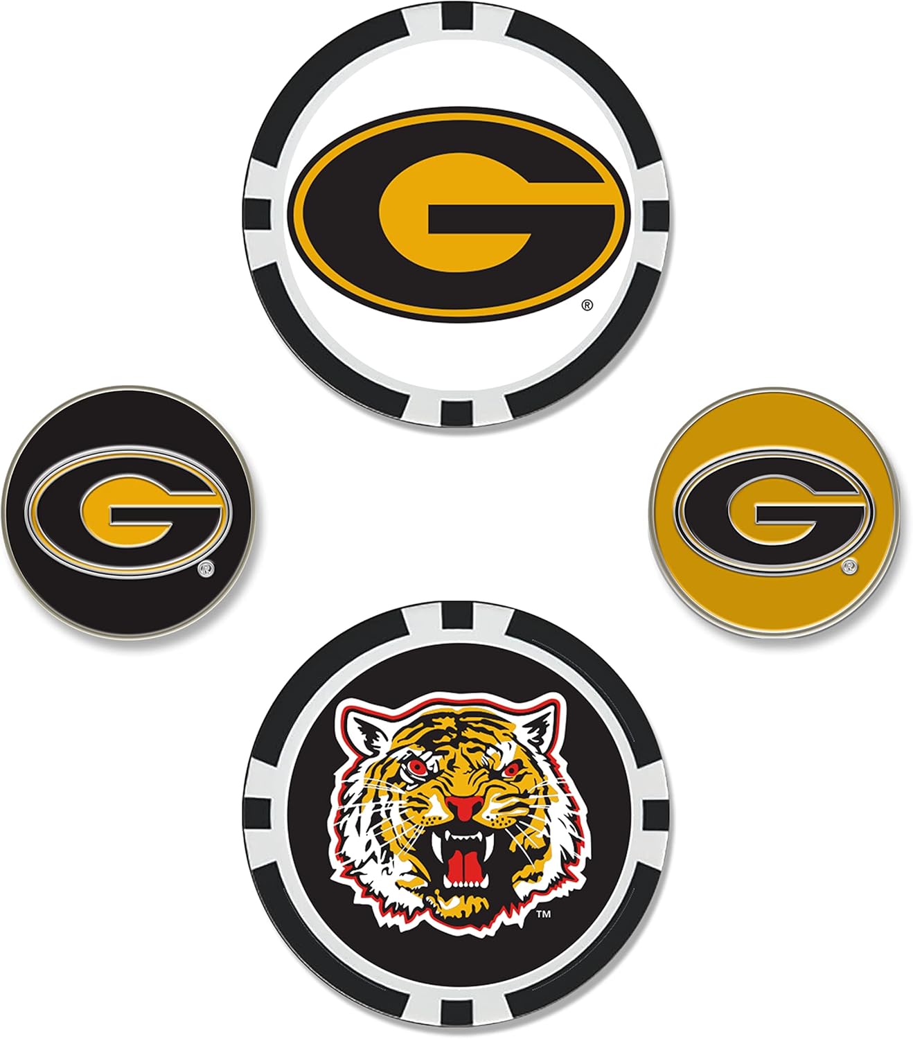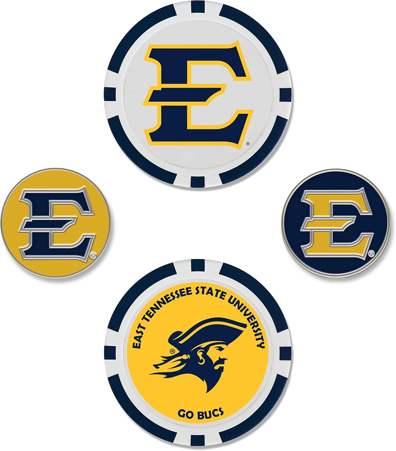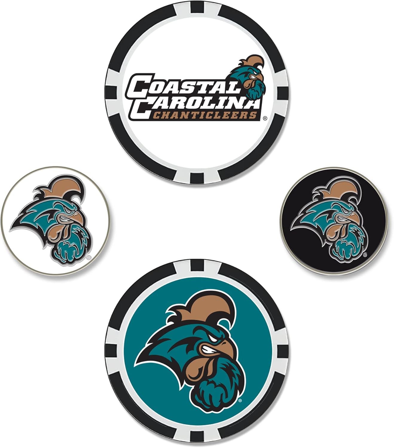 Ball marker set includes two oversized 40mm ball markers embellished with multiple team trademarks and two 25mm iron-stamped ball markers with team trademarks.