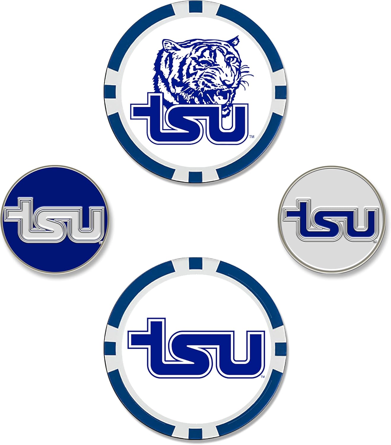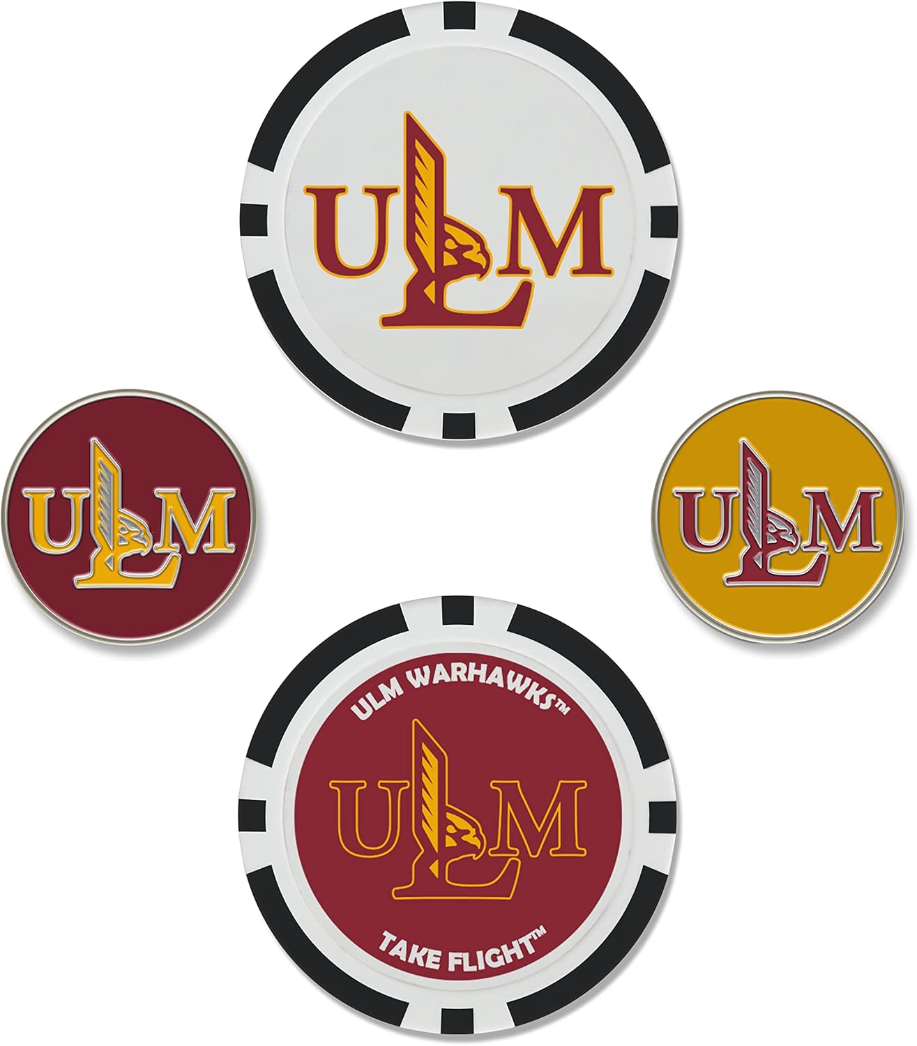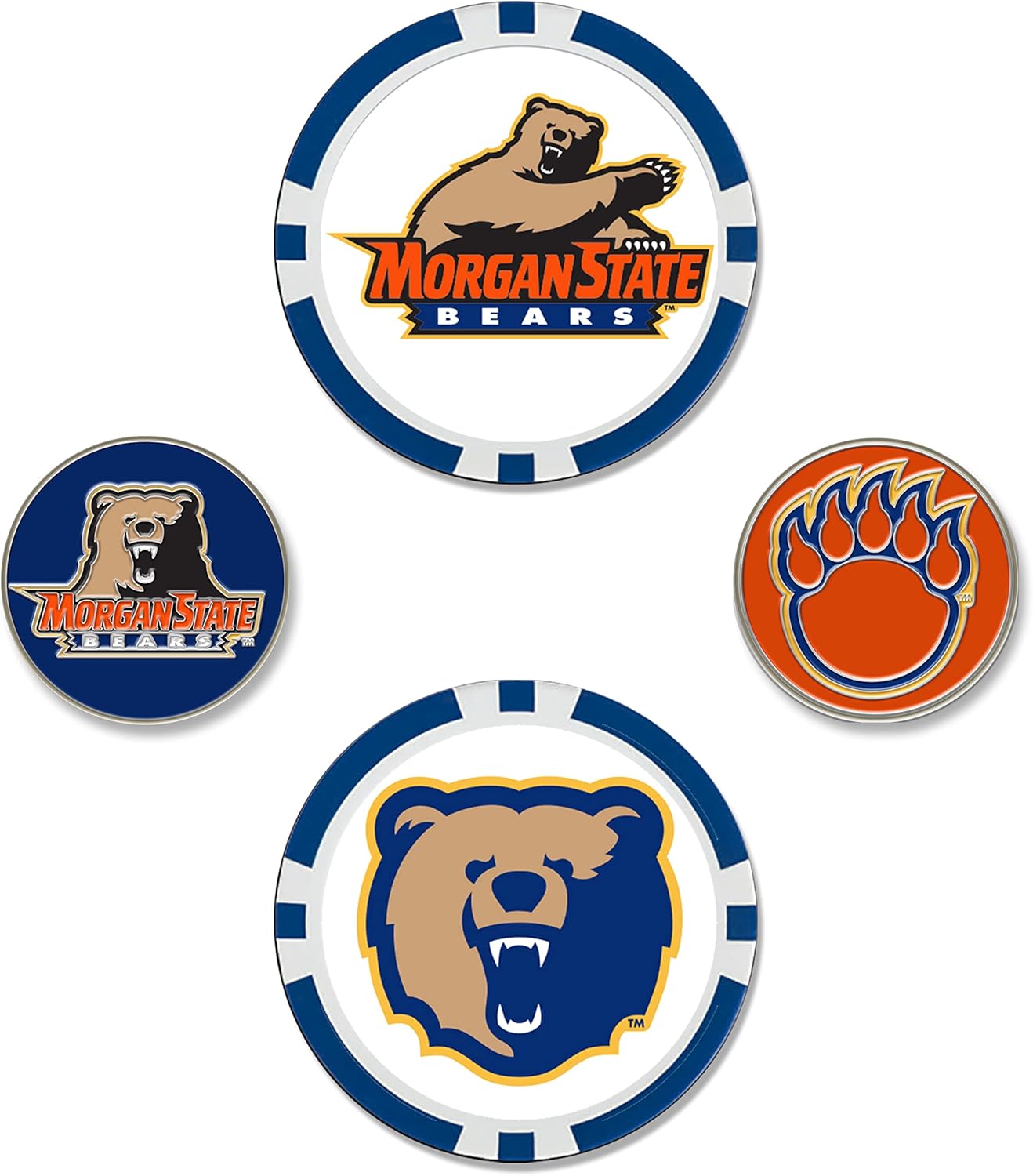 Ball marker set includes two oversized 40mm ball markers embellished with multiple team trademarks and two 25mm iron-stamped ball markers with team trademarks.