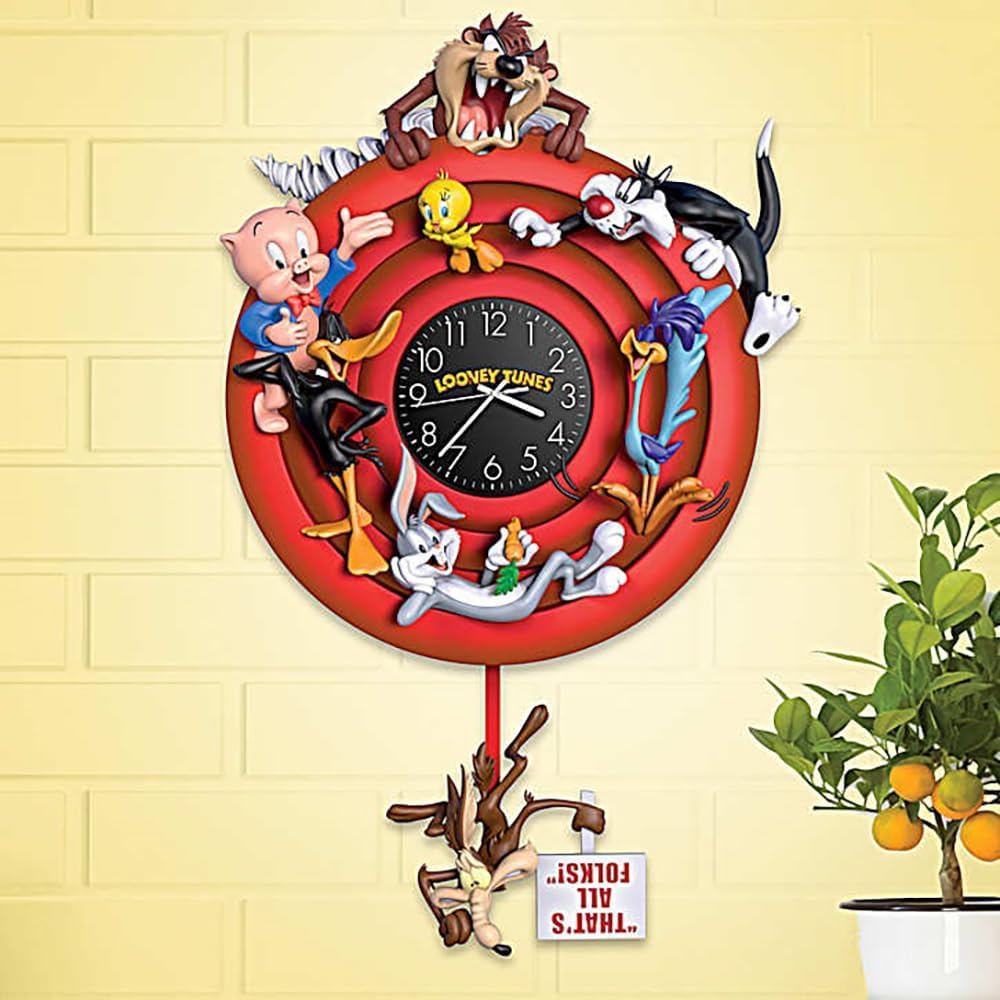 For generations, viewers of all ages have laughed along with the LOONEY TUNES rascals and the pure wackiness that always seems to ensue. Now, you can make it cartoon time all the time with the LOONEY TUNES Wall Clock, a limited edition available only from The Bradford Exchange. Starring BUGS BUNNY, DAFFY DUCK, PORKY PIG, TWEETY, SYLVESTER, TASMANIAN DEVIL, ROAD RUNNER and WILE E. COYOTE all around the iconic bullseye, this officially licensed wall clock is sure to be a prized addition to your LOONEY TUNES decor! An impressive 16 inches high, this heirloom-quality clock is intricately sculpted and masterfully hand-cast of artist's resin. The closer you look, the more you'll appreciate our artisans' unparalleled mastery as each LOONEY TUNES star's personality is captured to perfection. The exquisite hand-painting brings every daffy detail to life, and the quartz movement ensures accurate timing. The fun continues right down to the working pendulum, where Wile E. Coyote declares, "THAT'S ALL FOLKS!"