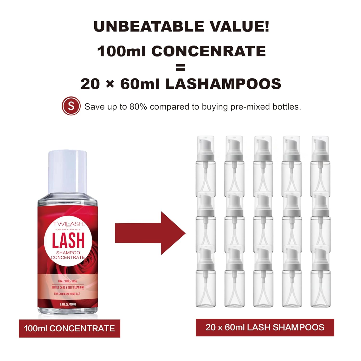 The Same Trusted Formula. A Smarter Way to Clean. Maintain the integrity of your eyelash extensions with the TWILASH Concentrate Kit. Developed to meet the rigorous standards of professional lash artists, this system brings the quality of our signature lash shampoo into a versatile, high-yield format. Why Choose the TWILASH Concentrate System? High Capacity: One 3.38 fl.oz (100ml) bottle creates up to 40 fl.oz of finished solution. Precision Rinsing: Includes a 5 fl.oz (150ml) Rinse Bottle to ensure no residue is left behind. Salon Economics: Replaces approximately 20 standard retail units (2 fl.oz size). The Kit Includes: 1x 100ml (3.38 fl.oz) Lash Shampoo Concentrate 1x 150ml (5 fl.oz) Precision Rinse Bottle (Empty, for water) 1x 30ml (15 fl.oz) Measuring Cup