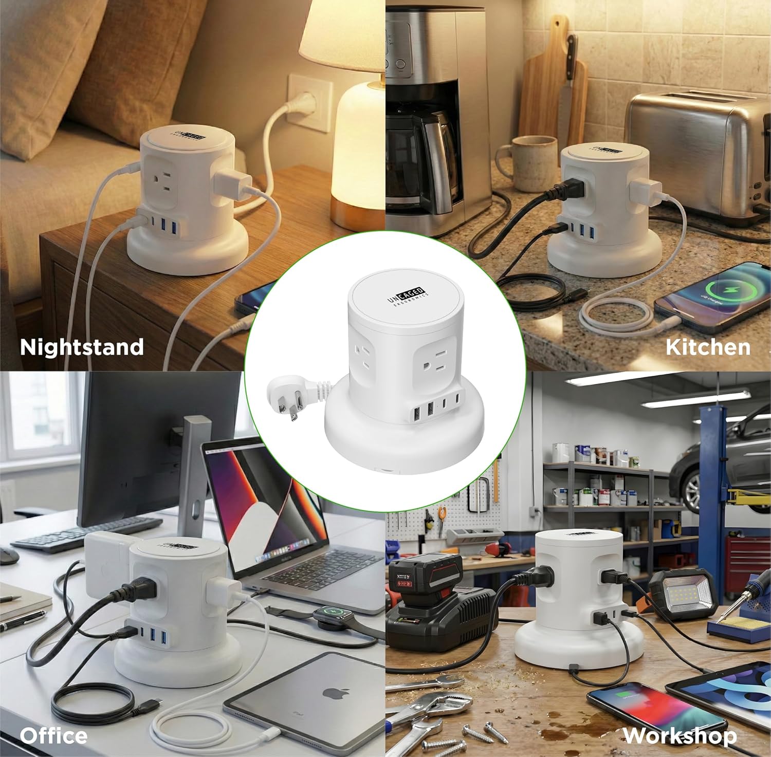 "Upgrade your workspace with the Uncaged Ergonomics retractable power strip, a modern surge protector with USB ports designed for clean, efficient charging. This compact power strip tower with USB ports combines four AC outlets with USB-A and USB-C fast charge capability, allowing you to power laptops, phones, tablets, and accessories from one organized hub. The built-in retractable power strip cord extends up to six feet and retracts automatically, helping eliminate cable clutter around desks, nightstands, and workbenches. Its upright, space-saving design functions as an organized charging station while offering mounting options for walls or surfaces. Engineered with safety and a heavy-duty copper cable, this surge protector supports high-capacity power delivery while protecting connected devices. Whether used as a night stand plug station, desktop hub, or workshop solution, this charging tower delivers convenience, safety, and fast charging in one sleek design."