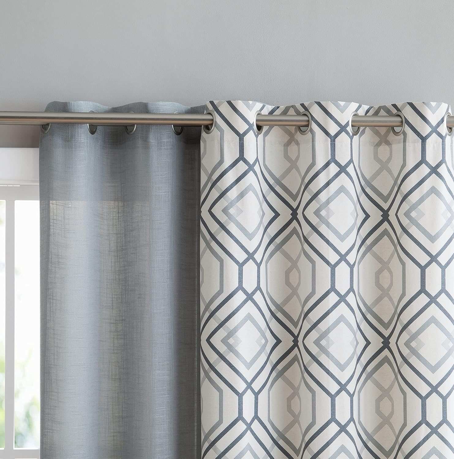 Create a layered look with this 4-piece panel set, which features two sheer trellis panels and two textured solid panels.