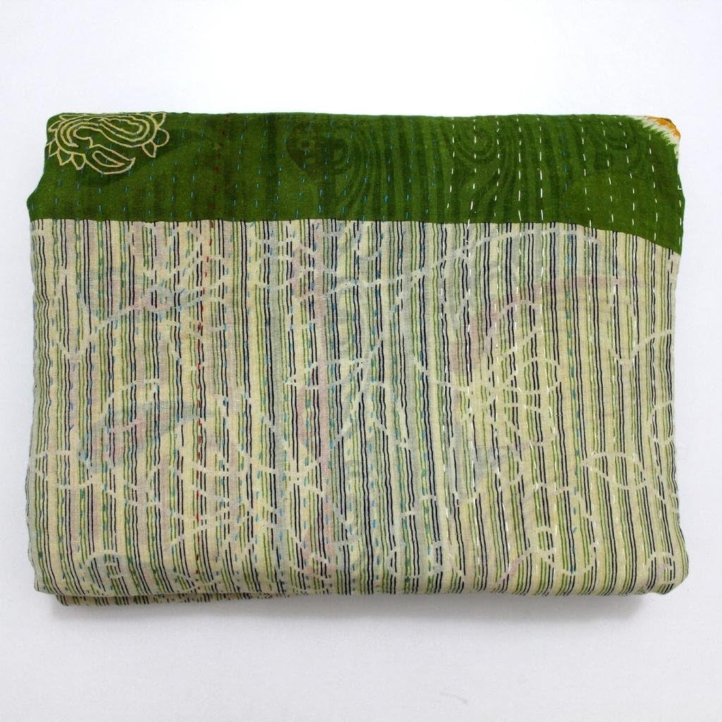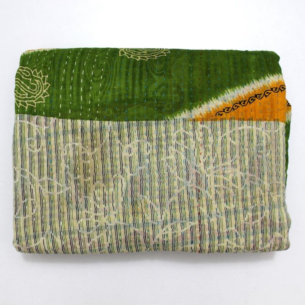 - This Quilt has different beautiful warm and charming colours, designs and patterns on either side which gives a distinct look & thus can be used both sides (REVERSIBLE). These quilts are famed and admired due to their Kantha work. - It is an old age tradition in rural India to recycle used old sari for making quilts/throws. Kantha is still the most popular form of embroidery practiced by rural women in India. The way in which the stitches have been done by hand makes the quilt extraordinary. This quilt is 100% Organic & eco-friendly. - Whether you drape it over your bed, couch, or favourite chair, it’s sure to make a statement and breathe new life into your decor. Bright colours add vibrancy to your living space / bedroom. Buy a few to add a kaleidoscope of color to any room. Purchasing a Fair trade Kantha Quilts creates employment opportunities and a sustainable life for the women artisans and their families. - It can be used in a variety of ways as quilt, blanket, bed cover, bed throw, bedspread, table cover, coverlet, curtains, wall hanging, tapestry, rug for picnics/beaches and carpet. - Due to Kantha stitches it gives enough strength and durability for washing by hands and also it can be cold washed through washing machine. - As these are made by old used recycled sarees hence they may have some loose threads, open ends, small spots/stain and small patches (Patches from other colourful sarees), which is very rare since each item is handpicked and these things are not being considered as defects, as item is made of vintage material. This is a normal part of the work for 100% handmade quilt, which adds more beauty to its character, but there won't be any compromise in quality. However, we think you are more likely to be amazed by how perfect a handmade product can be and time taken to make this quilt.