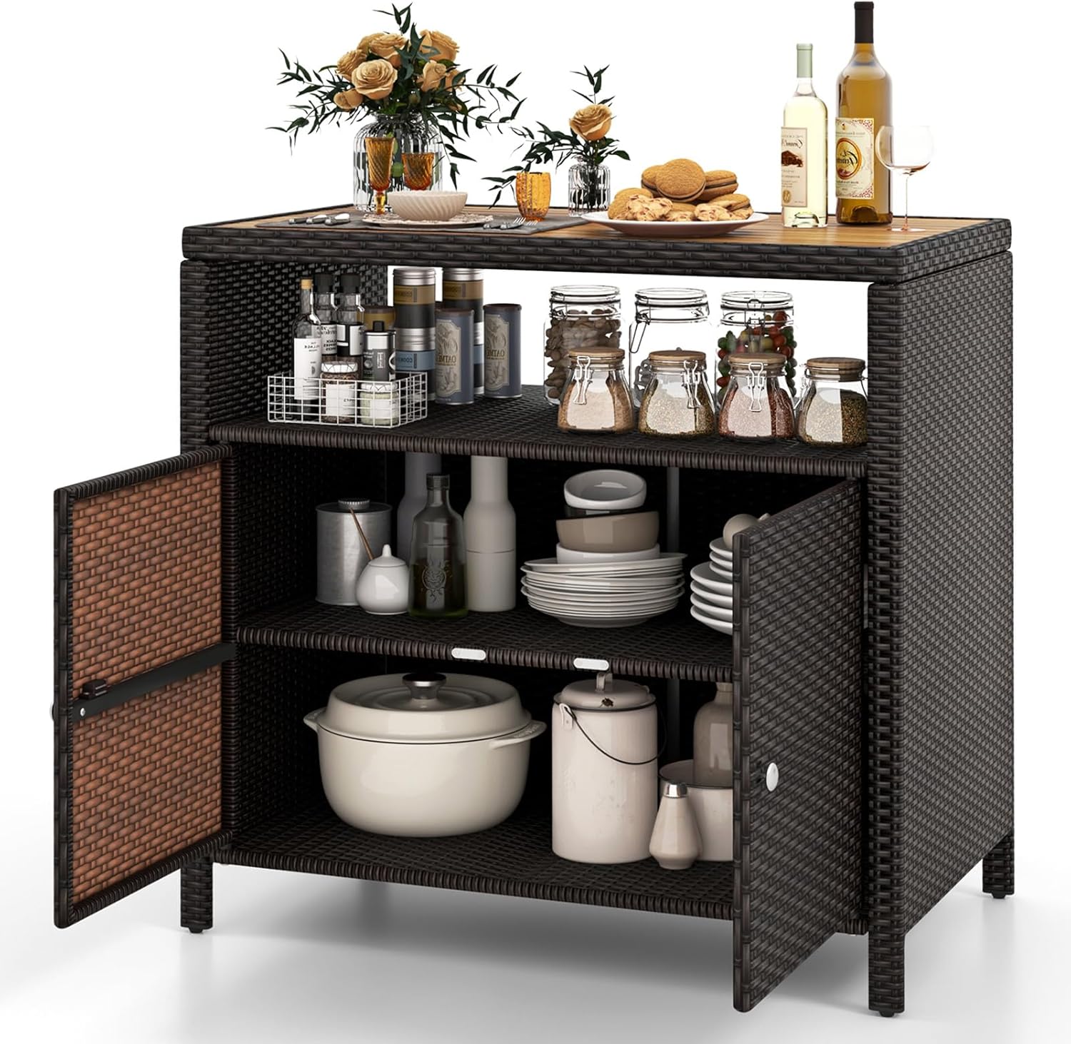 Description: Upgrade your outdoor living space with this stylish and practical rattan storage cabinet. Designed to combine functionality and elegance, this patio cabinet offers generous space for organizing everyday items while keeping your outdoor area neat and inviting.Featuring a handwoven rattan exterior and a sturdy frame, this outdoor storage cabinet blends natural texture with reliable support. The spacious tabletop is perfect for preparing drinks, serving food, or displaying plants, while the shelves and enclosed cabinet help keep tools, tableware, and accessories well organized.Ideal for patios, balconies, gardens, backyards, or poolside areas, this versatile patio sideboard cabinet adds convenience and charm to any outdoor setting.Features: Spacious countertop and shelves for organizing patio tools tableware plantsOpen shelf design for quick access to frequently used outdoor itemsDouble door cabinet for concealed storage and neat outdoor spaceSturdy metal frame for strong support and stable cabinet structureAdjustable foot pads for balance on uneven patio garden groundHandwoven PE rattan surface for textured appearance and outdoor useSolid acacia wood countertop for serving drinks preparing food displaying itemsIncludes clear instruction manual for guided assembly and accurate installationSpecifications: Color of Rattan: Black/Brown/GreyMaterials: PE Rattan, Acacia Wood, MetalOverall Dimensions: 35.5" x 21" x 34" (L x W x H)Size of Open Compartment: 32.5" x 21" x 8" (L x W x H)Size of Inner Shelf: 34" x 19" (L x W)Inner Shelf Spacing: 10"Height off the Ground: 3.5"Load Capacity of Cabinet Top: 100 lbsLoad Capacity of Open Compartment: 33 lbsLoad Capacity of Each Inner Shelf: 33 lbsNet Weight: 37.5 lbsPackage Includes:1 x Outdoor Storage Cabinet1 x Instruction