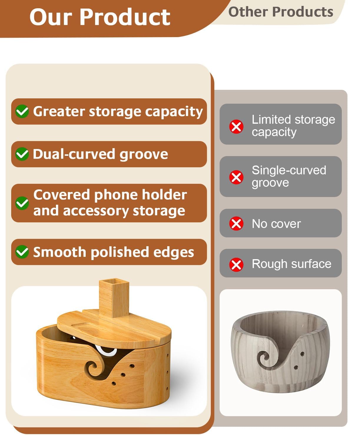 Feature: This premium pine wood yarn bowl set combines functionality and convenience, perfect for knitters and crocheters of all skill levels. Featuring a large, oval design with dual curling slots to prevent yarn tangles. The ingenious lid doubles as a phone stand (for hands-free pattern following) Sturdy, smooth, and burr-free, the wood protects yarn from snags This all-in-one 9-piece kit has everything you need to start creating—no extra tools required. Product size - Dimensions: 11.8×5.9×6.3 inches Include - 1× Pine wood yarn bowl with lid - 9× High-quality metal crochet hooks (various sizes) Notes - New wooden items may have a slight varnish scent, which will naturally fade within 2-3 days when placed in a well-ventilated area. - The smooth, burr-free finish ensures no snags or damage to yarn, but avoid excessive moisture to maintain wood qualit