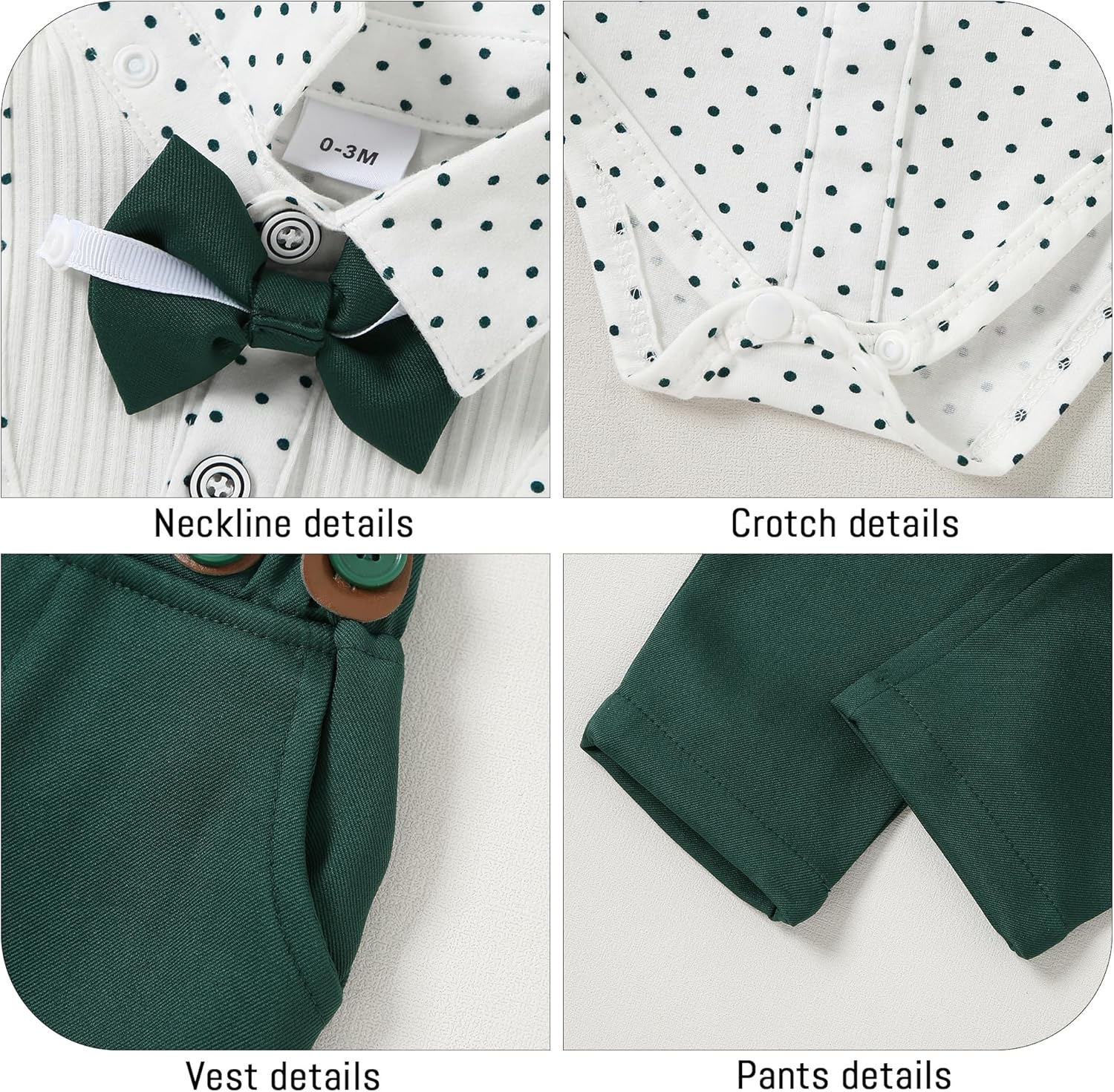 MATERIAL: The baby boy suits is made of High quality cotton blend fabric , soft, breathable and skin friendly. The top with removable bowtie and buttons at the bottom of the shirt for easy diaper changes, practical and convenient. DESIGN INSPIRATION: A dashing baby boy outfits ensemble featuring classic and innovative color combinations to add depth. The vest boasts a V-neck and faux pocket design, ensuring your little one stands out in the crowd, radiating a handsome and eye-catching charm. OCCASIONS: This suits for baby boys are perfect for both formal and casual occasions, such as weddings, baptisms, gatherings, birthdays, church events, parties, or everyday wear. It also makes a great gift for boys, making your little one look handsome and gentlemanly, becoming the center of attention wherever he goes. RECOMMENDED AGE: Suitable for 0-3 months newborn boy clothes, 3-6 months baby boy clothes, 6-12 month boy clothes, toddler baby boy clothes 12-18 months, Please refer to our size chart to find the most suitable size for your baby boys. THE PACKAGE INCLUDES: 1*dress shirt + 1*bowtie + 1*vest + 1*pair of pants +1*suspenders. Provide your baby with the most comfortable and stylish dressing experience for occasions such as Easter, Thanksgiving, Christmas, first birthday, and everyday wear.